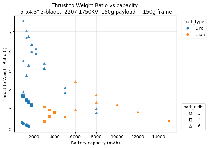 Thrust-to-Weight ratio vs Battery Capacity for different battery types and number of cells.