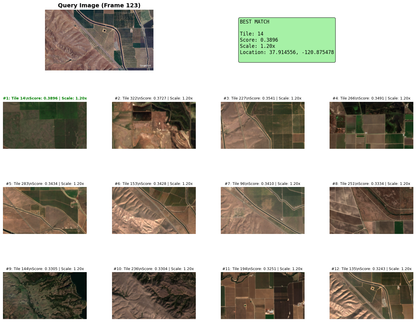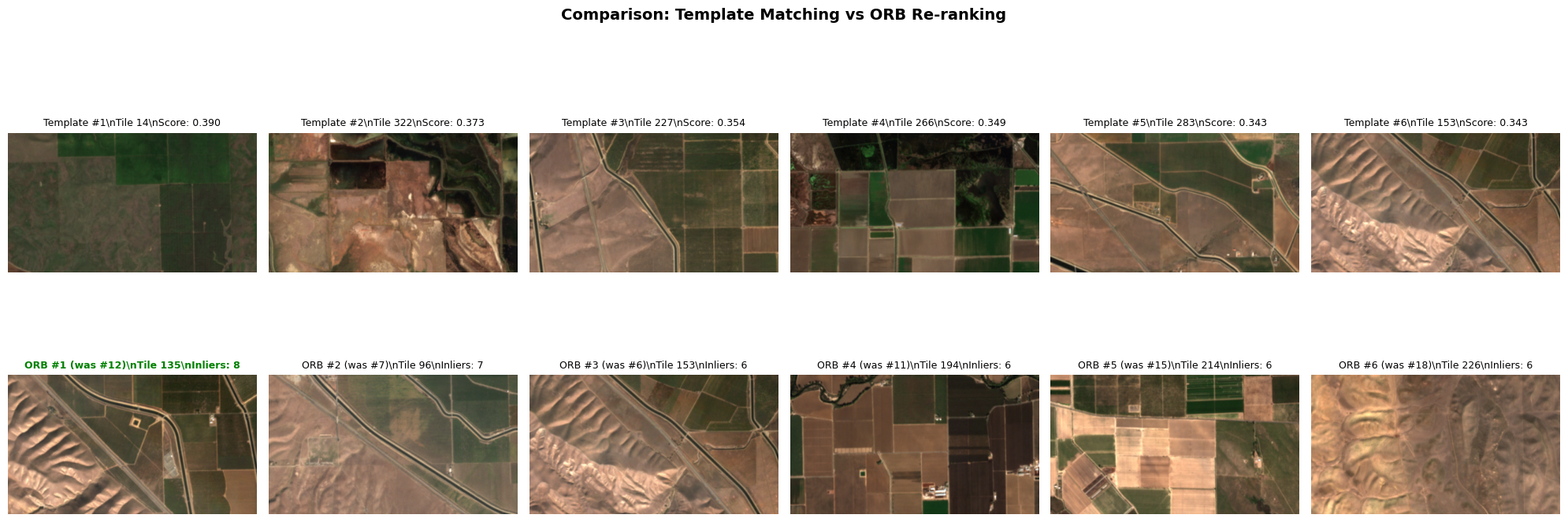 Note: why not just skip the template matching and test ORB feature matching across all cut satellite tiles (template matching is sensitive to scale and changes in rotation, whereas ORB is rotation-invariant and more robust to scale changes).