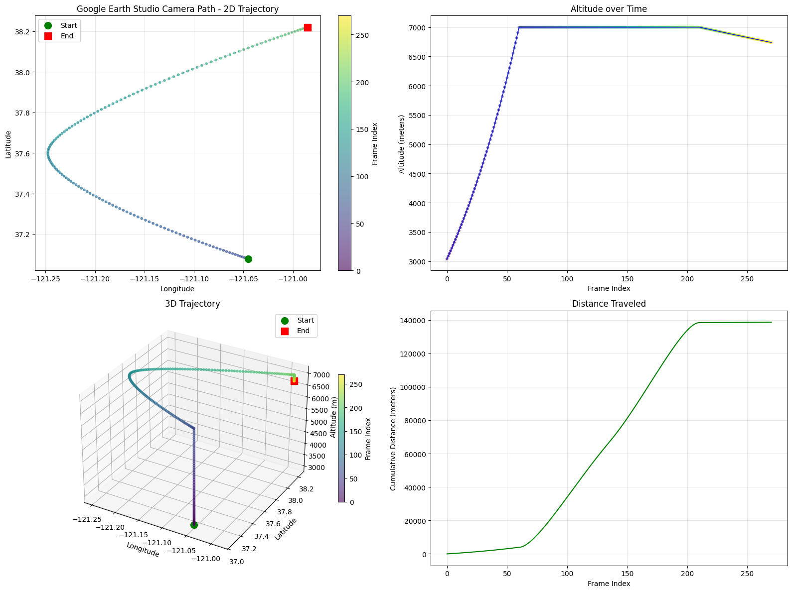 3D tracking data generated by Google Earth Engine, providing camera ground truth location. Camera FOV here was originally set to the default 20 degrees, but should be set to a higher value, which would allow for larger coverage at a lower altitude (which makes more sense for a drone).