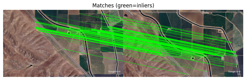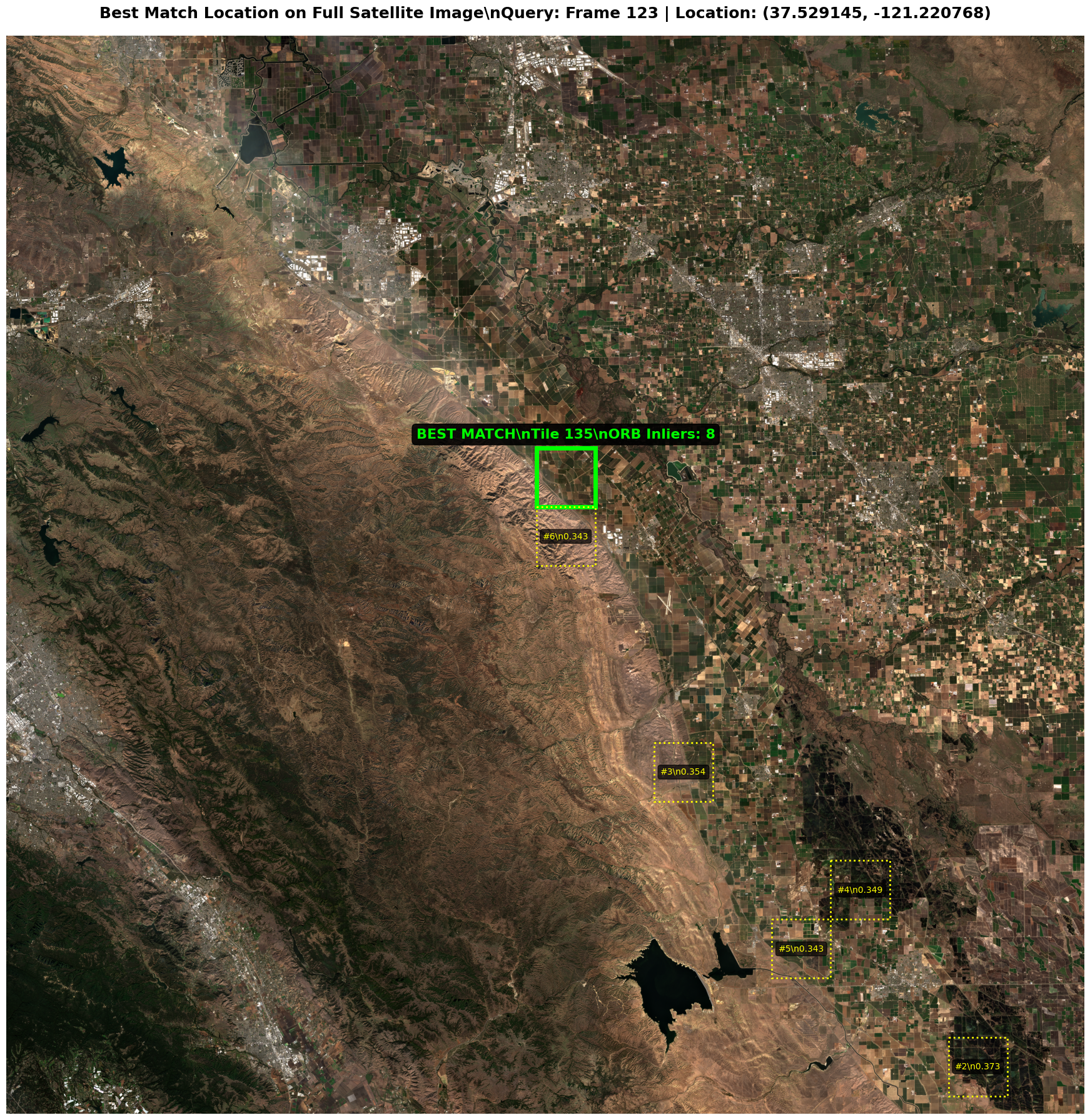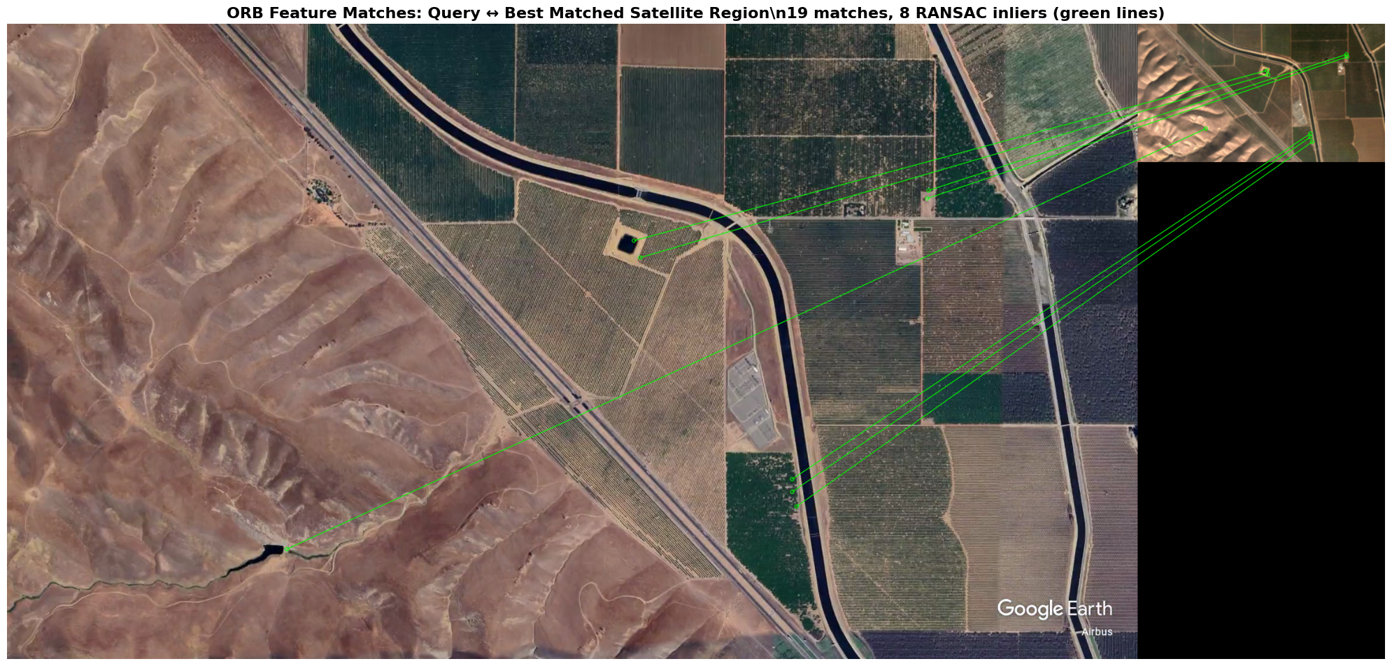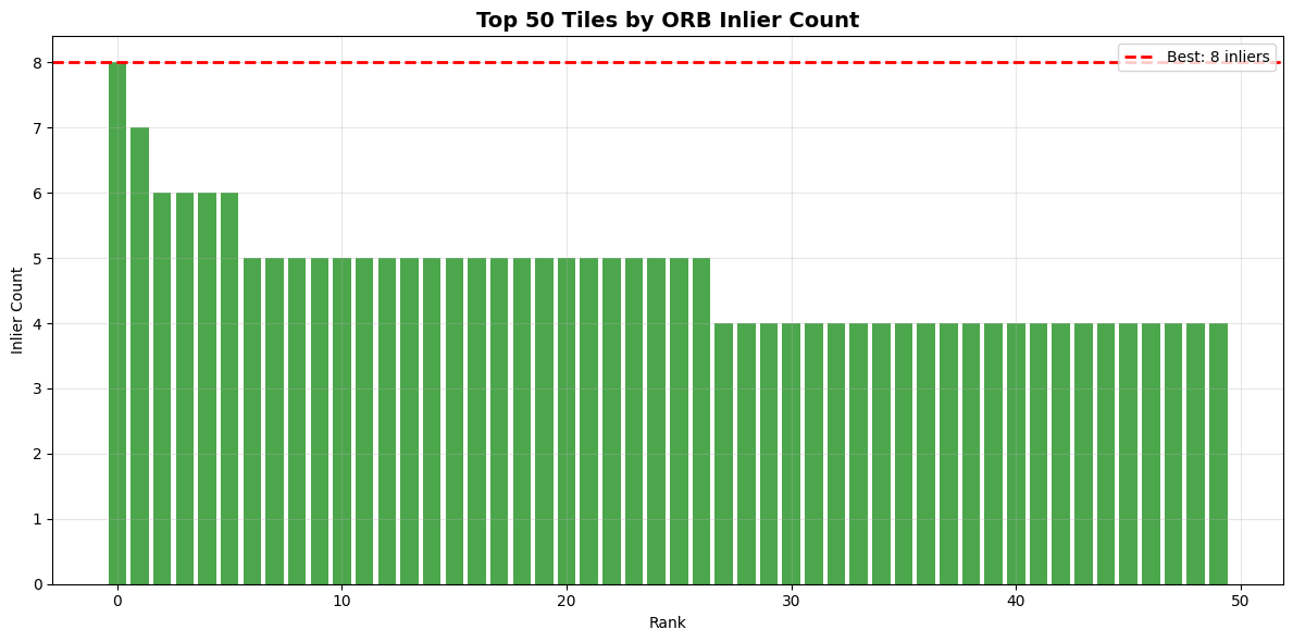 Note: we see here that this is likely not a robust solutions, as other incorrect solutions are not far behind in terms of the number of ORB keypont inliers. We could easily imagine considering an image frame with much less distinguishing features than the considered aerial frame here (fully mountainous, worst case mostly featureless image). It should also be tested how robust this approach is for changes in heading, altered terrain in parts of the area, altered lighting conditions, altered color due to seasons, … The full satellite imagery here is also relatively small, although we can assume in the case of drones that we can already have a reasonably close initial guess on gps location. The approach tested here is by no means the best, but is a fun project to test out different computer vision concepts.